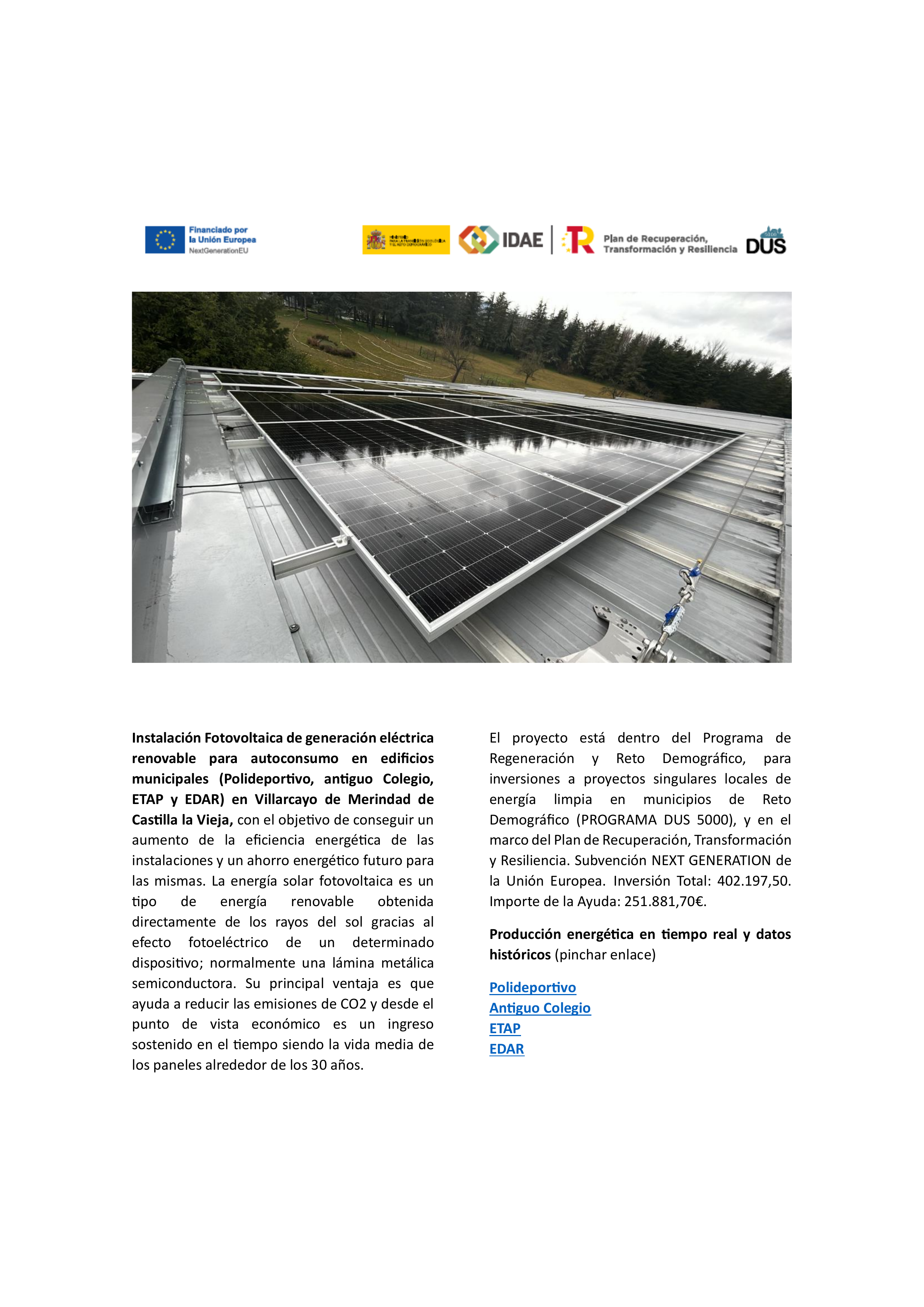Instalación Fotovoltaica de generación eléctrica renovable para autoconsumo en edificios municipales (Polideportivo, antiguo Colegio, ETAP y EDAR) en Villarcayo de Merindad de Castilla la Vieja, con el objetivo de conseguir un aumento de la eficiencia energética de las instalaciones y un ahorro energético futuro para las mismas. La energía solar fotovoltaica es un tipo de energía renovable obtenida directamente de los rayos del sol gracias al efecto fotoeléctrico de un determinado dispositivo; normalmente una lámina metálica semiconductora. Su principal ventaja es que ayuda a reducir las emisiones de CO2 y desde el punto de vista económico es un ingreso sostenido en el tiempo siendo la vida media de los paneles alrededor de los 30 años.